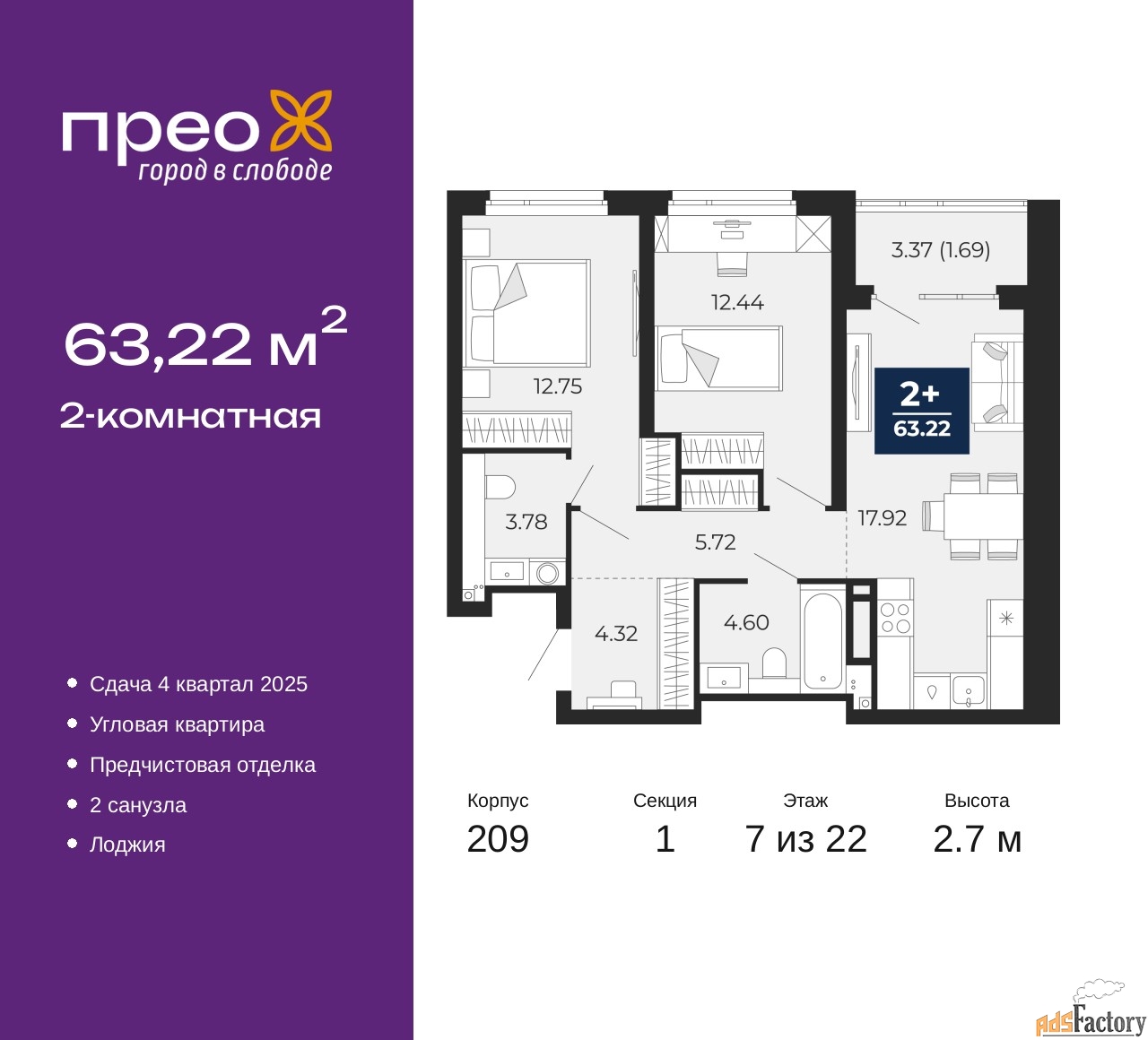 Квартира находится в корпусе 209. Дом монолитный, одноподъездный, высотой 22 этажа. На этаже 8 квартир. В подъезде 1 пассажирский и 1 грузовой лифт. Окончание строительства - 4 квартал 2025 года. Оформление сделки по договору долевого участия.