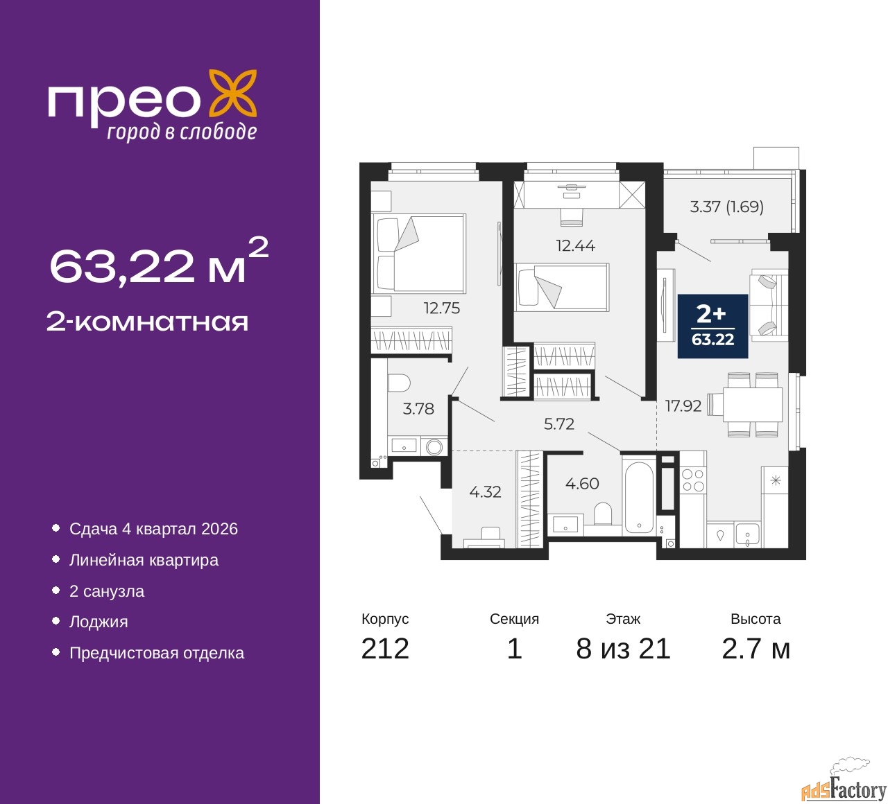 | Общая площадь (кв.м) | 63.22 |
