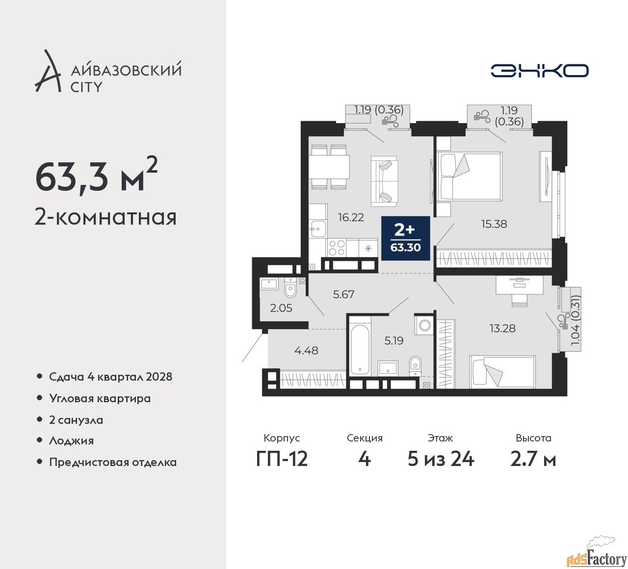 Дом монолитный, многоподъездный, высотой 24 этажа. Квартира находится в 4-й секции в корпусе ГП-12. На этаже 5 квартир. В подъезде 1 пассажирский и 1 грузовой лифт. Окончание строительства - 4 квартал 2028 года. Оформление сделки по договору долевого участия.