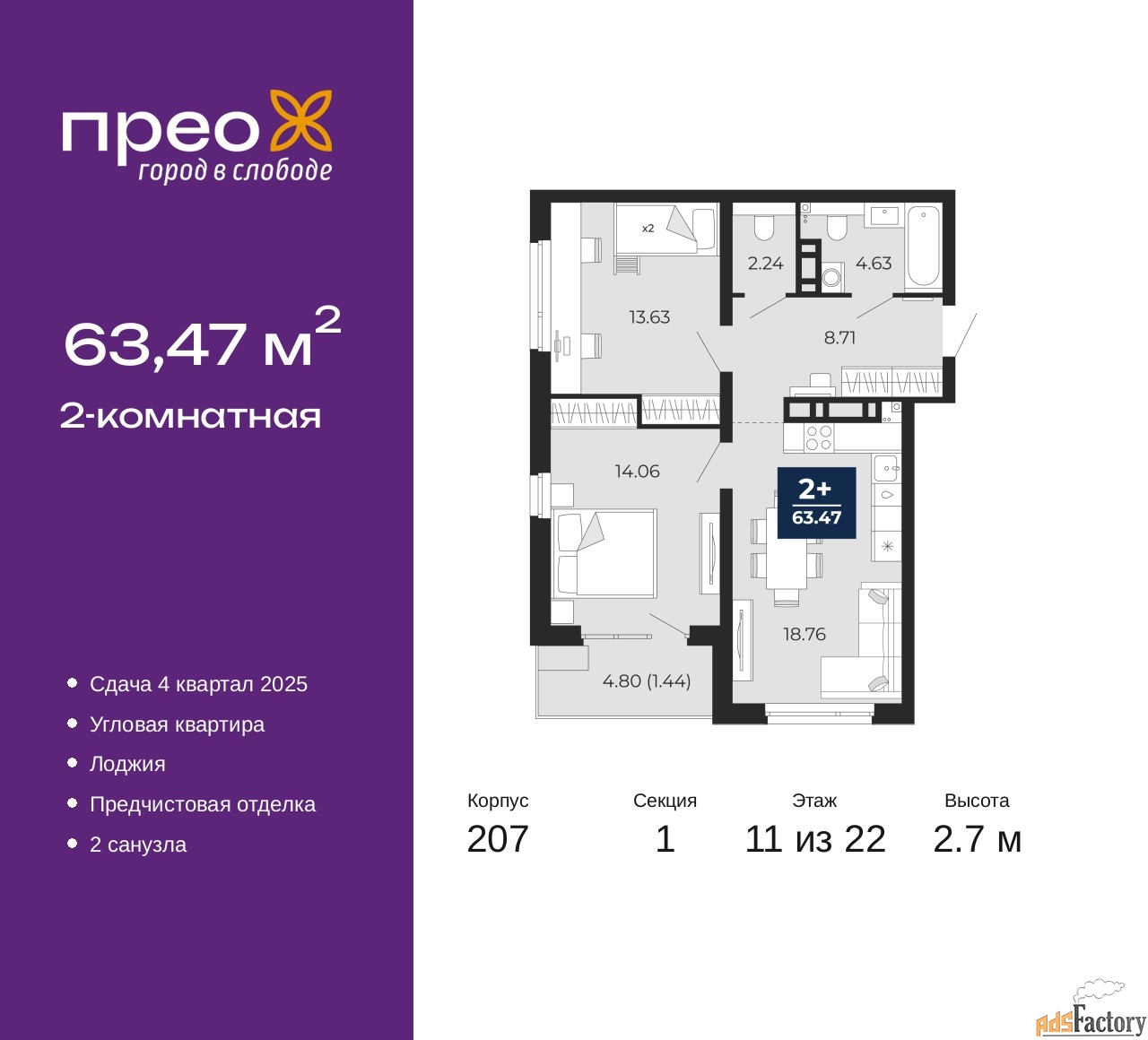 Дом монолитный, двухподъездный, высотой 22 этажа. Квартира находится в 1-й секции в корпусе 207. На этаже 8 квартир. В подъезде 1 пассажирский и 1 грузовой лифт. Окончание строительства - 4 квартал 2025 года. Оформление сделки по договору долевого участия.