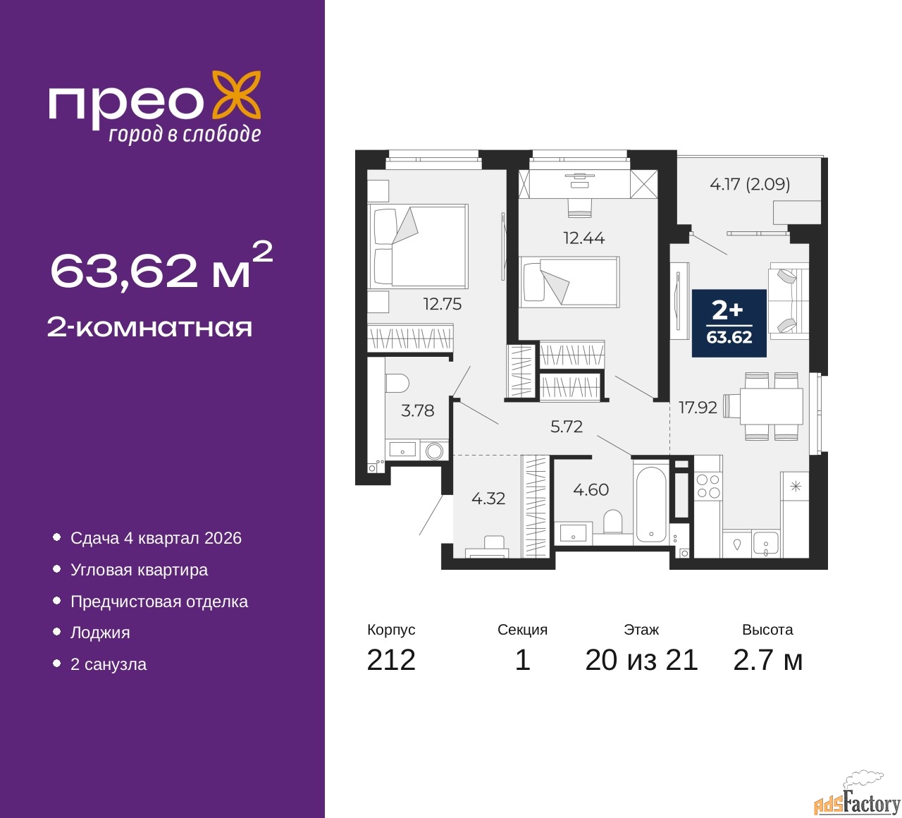 Квартира находится в корпусе 212. Дом монолитный, одноподъездный, высотой 21 этаж. На этаже 8 квартир. В подъезде 2 пассажирских и 1 грузовой лифт. Окончание строительства - 4 квартал 2026 года. Оформление сделки по договору долевого участия.