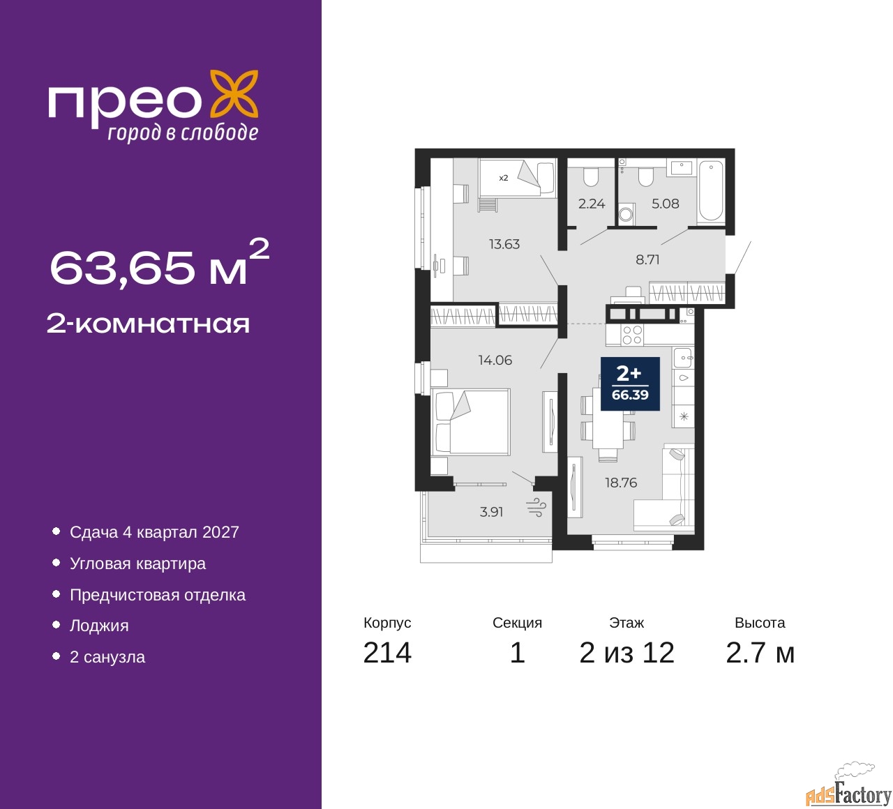 Дом монолитный, двухподъездный, переменной этажности, от 12 до 20 этажей. Квартира находится в 1-й секции высотой 12 этажей в корпусе 214. На этаже 8 квартир. В подъезде 1 пассажирский и 1 грузовой лифт. Окончание строительства - 4 квартал 2027 года. Оформление сделки по договору долевого участия.