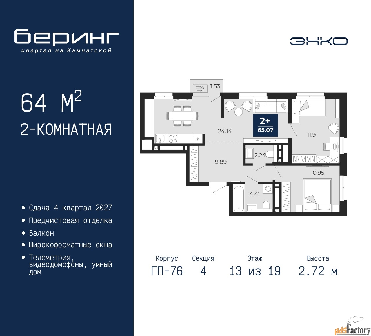 Дом монолитный, черырехподъездный, переменной этажности, от 19 до 24 этажей. Квартира находится в 4-й секции высотой 19 этажей в корпусе ГП-76. На этаже 5 квартир. В подъезде 1 пассажирский и 1 грузовой лифт. Окончание строительства - 4 квартал 2027 года. Оформление сделки по договору долевого участия.