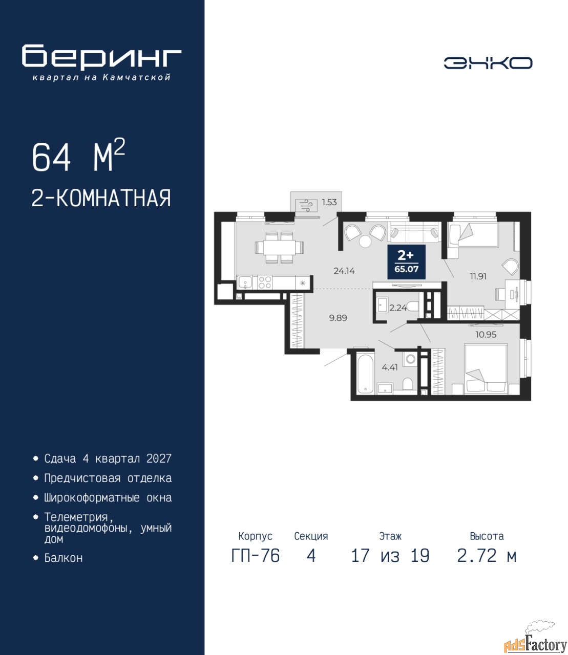 Дом монолитный, черырехподъездный, переменной этажности, от 19 до 24 этажей. Квартира находится в 4-й секции высотой 19 этажей в корпусе ГП-76. На этаже 5 квартир. В подъезде 1 пассажирский и 1 грузовой лифт. Окончание строительства - 4 квартал 2027 года. Оформление сделки по договору долевого участия.