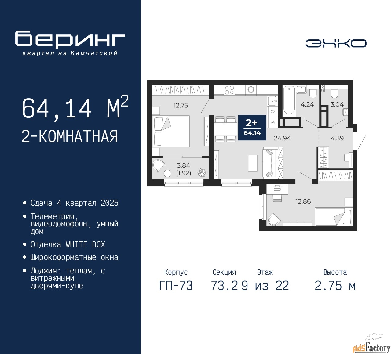 Дом монолитный, многоподъездный, переменной этажности, от 9 до 22 этажей. Квартира находится в 73.2-й секции высотой 22 этажа в корпусе ГП-73. На этаже 7 квартир. В подъезде 1 пассажирский и 1 грузовой лифт. Окончание строительства - 4 квартал 2025 года. Оформление сделки по договору долевого участия.