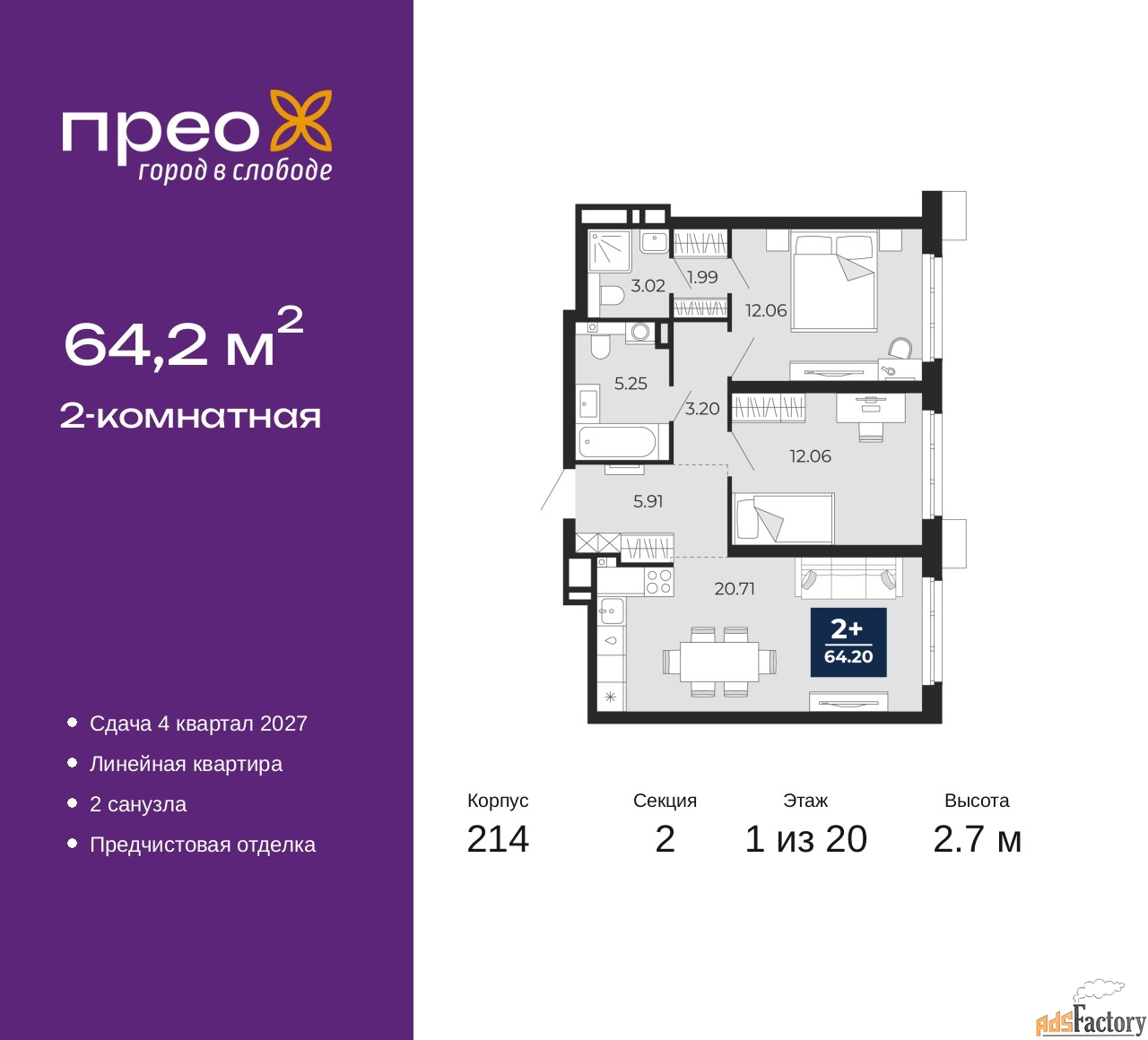 Дом монолитный, двухподъездный, переменной этажности, от 12 до 20 этажей. Квартира находится во 2-й секции высотой 20 этажей в корпусе 214. На этаже 8 квартир. В подъезде 1 пассажирский и 1 грузовой лифт. Окончание строительства - 4 квартал 2027 года. Оформление сделки по договору долевого участия.