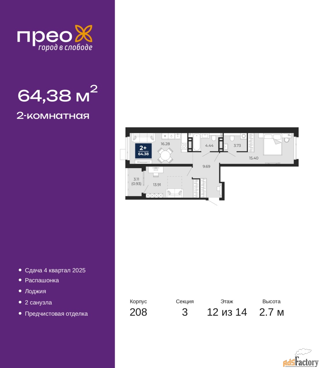 | Общая площадь (кв.м) | 64.38 |