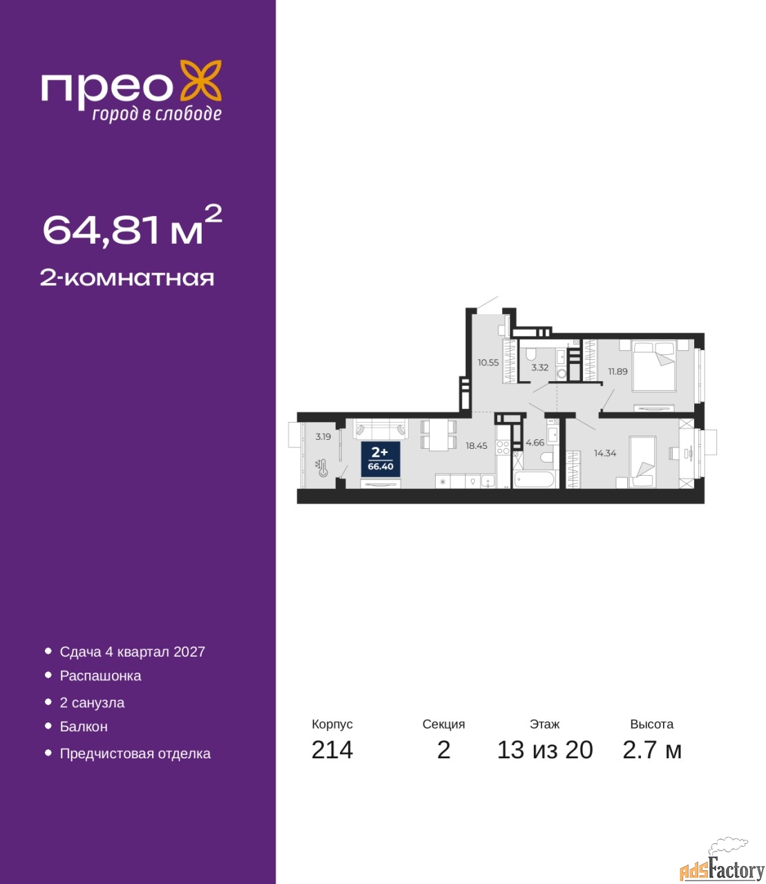 Дом монолитный, двухподъездный, переменной этажности, от 12 до 20 этажей. Квартира находится во 2-й секции высотой 20 этажей в корпусе 214. На этаже 8 квартир. В подъезде 1 пассажирский и 1 грузовой лифт. Окончание строительства - 4 квартал 2027 года. Оформление сделки по договору долевого участия.