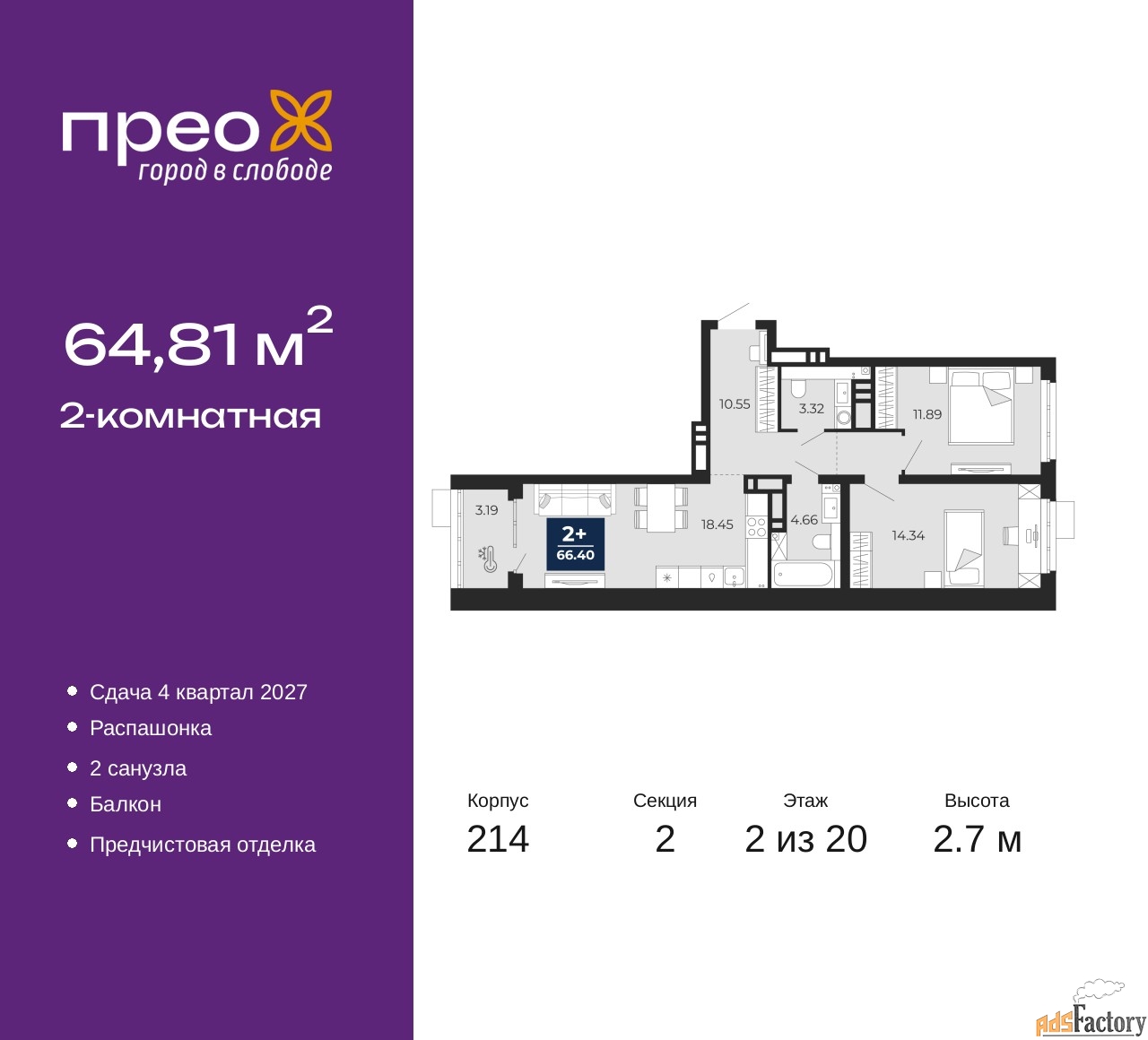 Дом монолитный, двухподъездный, переменной этажности, от 12 до 20 этажей. Квартира находится во 2-й секции высотой 20 этажей в корпусе 214. На этаже 8 квартир. В подъезде 1 пассажирский и 1 грузовой лифт. Окончание строительства - 4 квартал 2027 года. Оформление сделки по договору долевого участия.