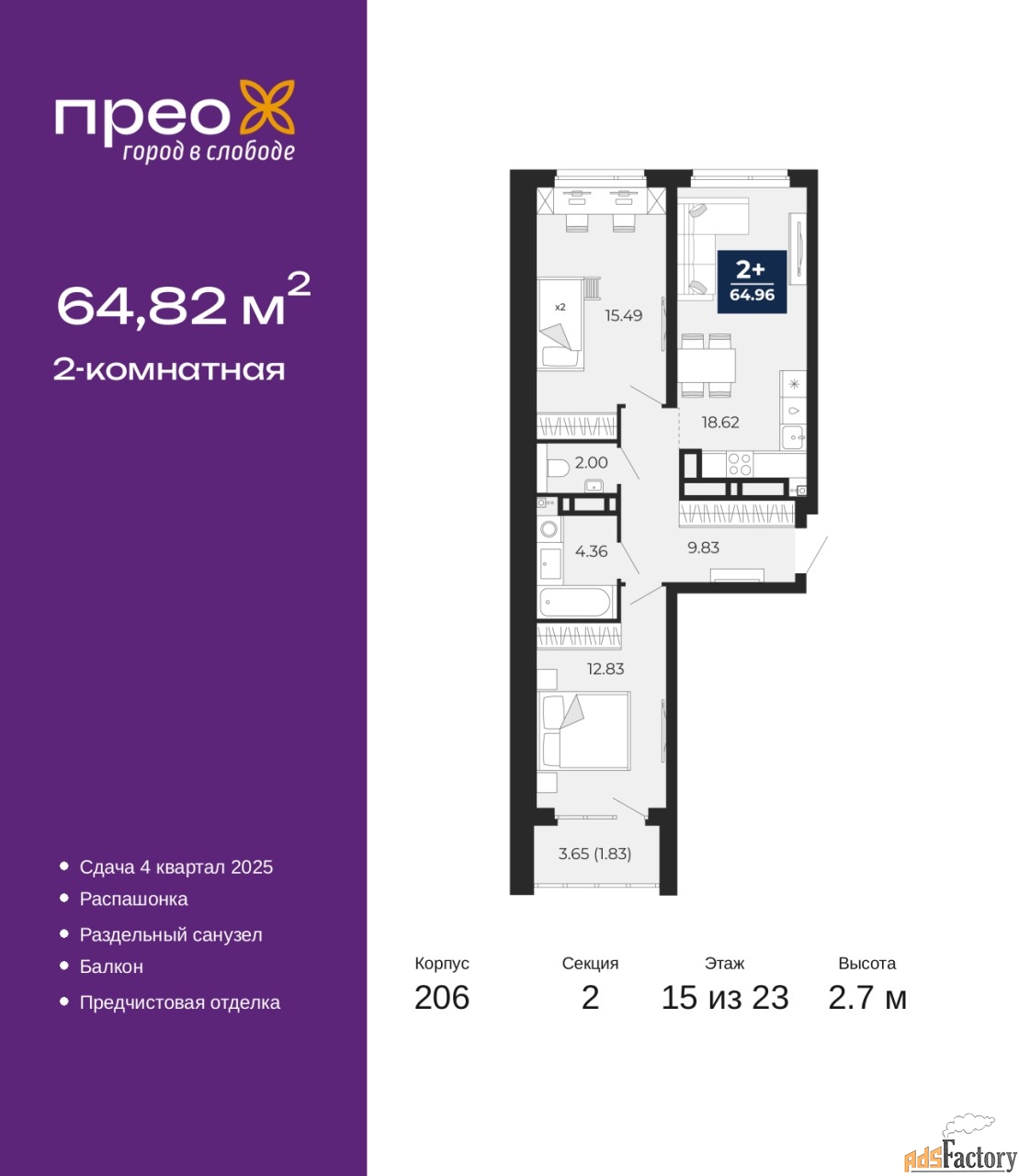Дом монолитный, трехподъездный, переменной этажности, от 14 до 23 этажей. Квартира находится во 2-й секции высотой 23 этажа в корпусе 206. На этаже 10 квартир. В подъезде 1 пассажирский и 1 грузовой лифт. Окончание строительства - 1 квартал 2026 года. Оформление сделки по договору долевого участия.