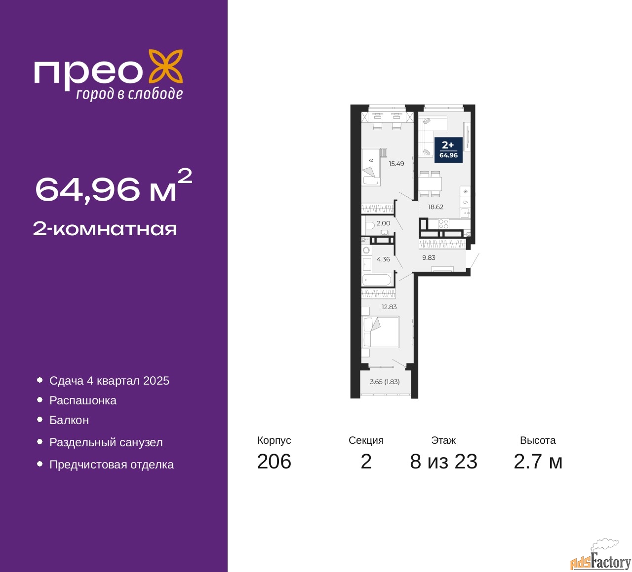 | Общая площадь (кв.м) | 64.96 |