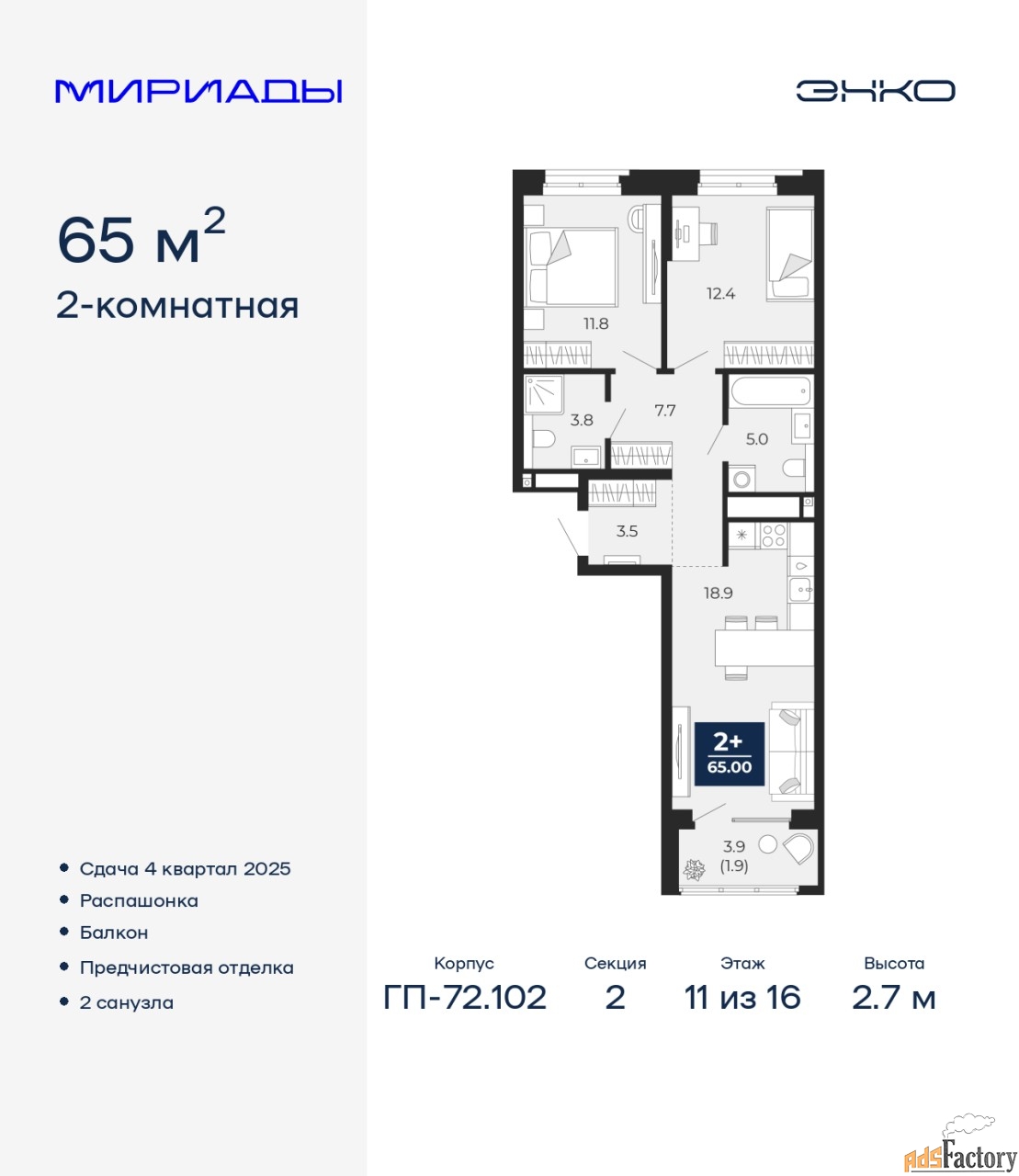 | Высота потолков (м.) | 2.7 |