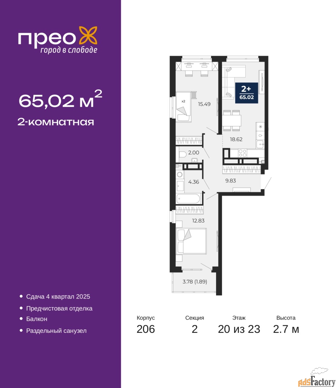 Дом монолитный, трехподъездный, переменной этажности, от 14 до 23 этажей. Квартира находится во 2-й секции высотой 23 этажа в корпусе 206. На этаже 10 квартир. В подъезде 1 пассажирский и 1 грузовой лифт. Окончание строительства - 1 квартал 2026 года. Оформление сделки по договору долевого участия.