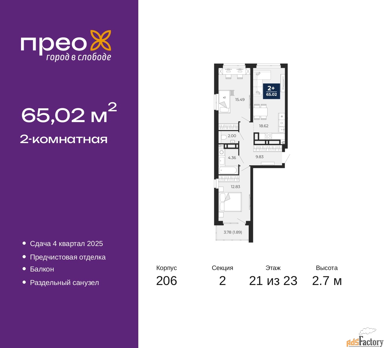 Дом монолитный, трехподъездный, переменной этажности, от 14 до 23 этажей. Квартира находится во 2-й секции высотой 23 этажа в корпусе 206. На этаже 10 квартир. В подъезде 1 пассажирский и 1 грузовой лифт. Окончание строительства - 4 квартал 2025 года. Оформление сделки по договору долевого участия.