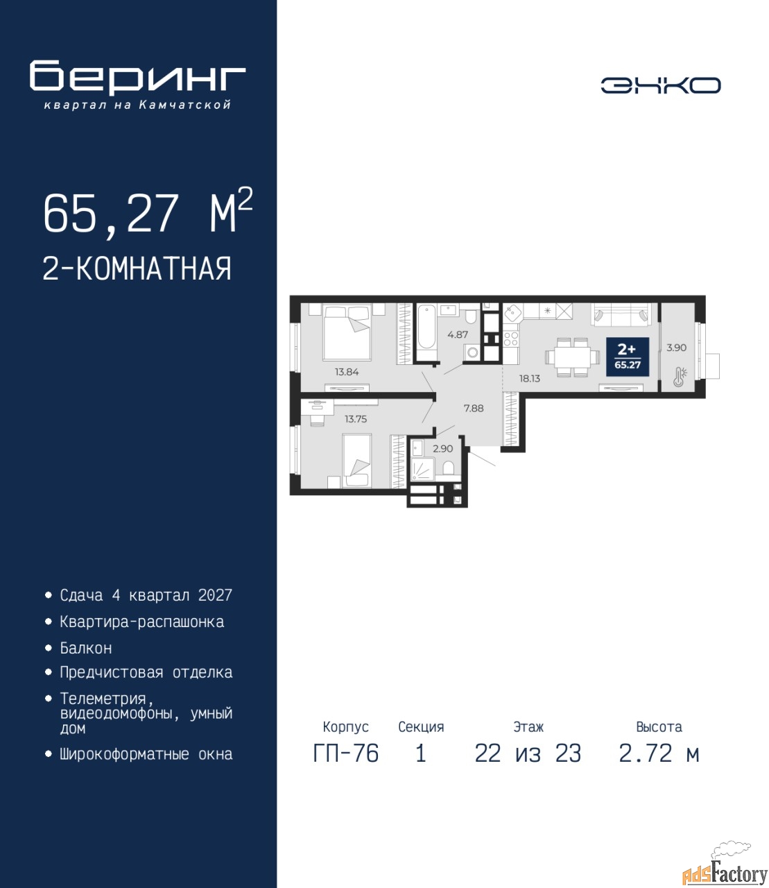 Дом монолитный, черырехподъездный, переменной этажности, от 19 до 24 этажей. Квартира находится в 1-й секции высотой 23 этажа в корпусе ГП-76. На этаже 7 квартир. В подъезде 2 пассажирских и 1 грузовой лифт. Окончание строительства - 4 квартал 2027 года. Оформление сделки по договору долевого участия.