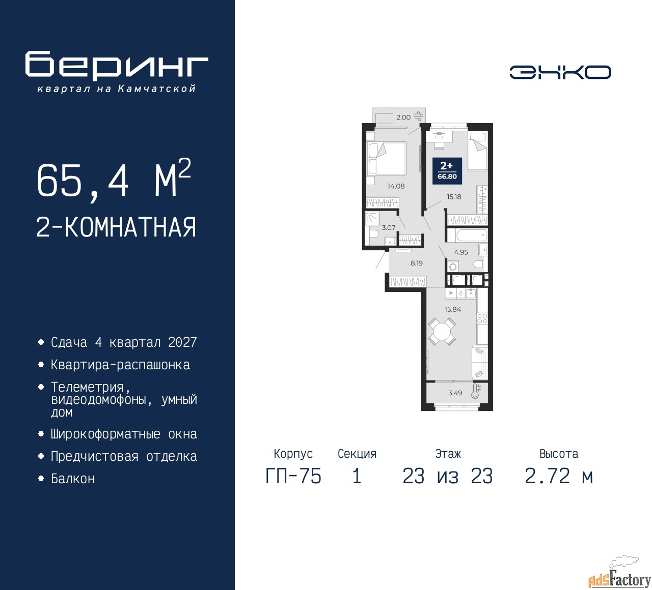 Дом монолитный, многоподъездный, переменной этажности, от 17 до 24 этажей. Квартира находится в 1-й секции высотой 23 этажа в корпусе ГП-75. На этаже 8 квартир. В подъезде 2 пассажирских и 1 грузовой лифт. Окончание строительства - 4 квартал 2027 года. Оформление сделки по договору долевого участия.
