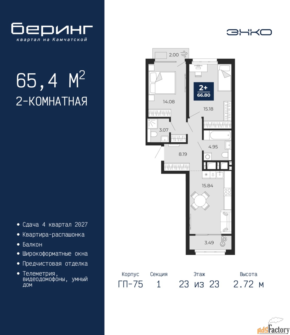Дом монолитный, многоподъездный, переменной этажности, от 17 до 24 этажей. Квартира находится в 1-й секции высотой 23 этажа в корпусе ГП-75. На этаже 8 квартир. В подъезде 2 пассажирских и 1 грузовой лифт. Окончание строительства - 4 квартал 2027 года. Оформление сделки по договору долевого участия.