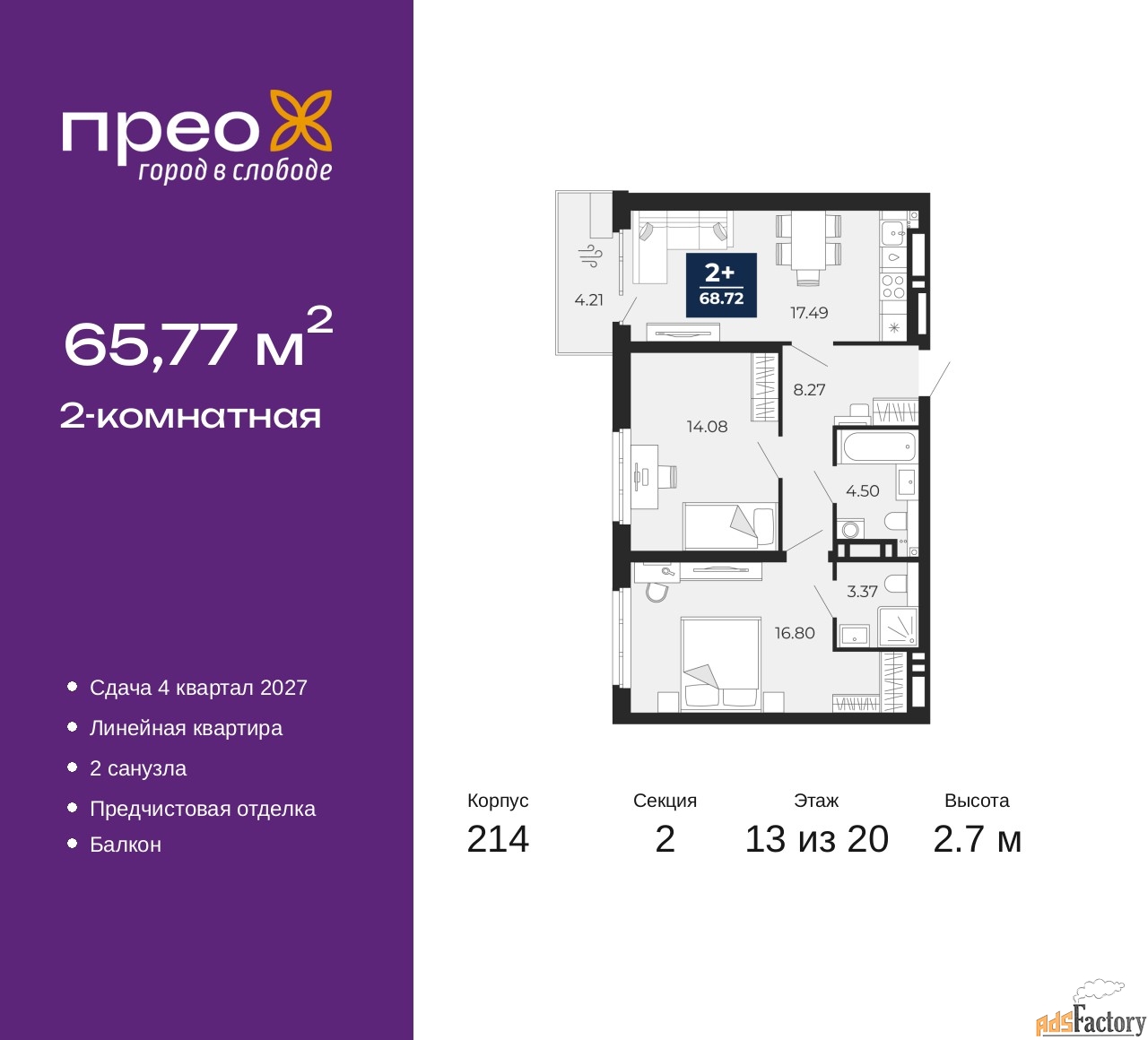 Дом монолитный, двухподъездный, переменной этажности, от 12 до 20 этажей. Квартира находится во 2-й секции высотой 20 этажей в корпусе 214. На этаже 8 квартир. В подъезде 1 пассажирский и 1 грузовой лифт. Окончание строительства - 4 квартал 2027 года. Оформление сделки по договору долевого участия.