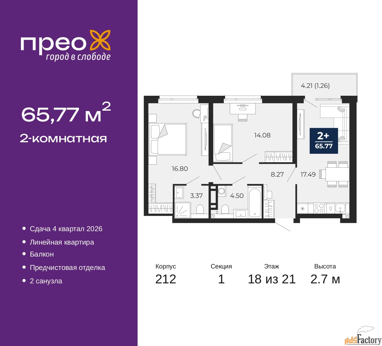 Квартира находится в корпусе 212. Дом монолитный, одноподъездный, высотой 21 этаж. На этаже 8 квартир. В подъезде 2 пассажирских и 1 грузовой лифт. Окончание строительства - 4 квартал 2026 года. Оформление сделки по договору долевого участия.