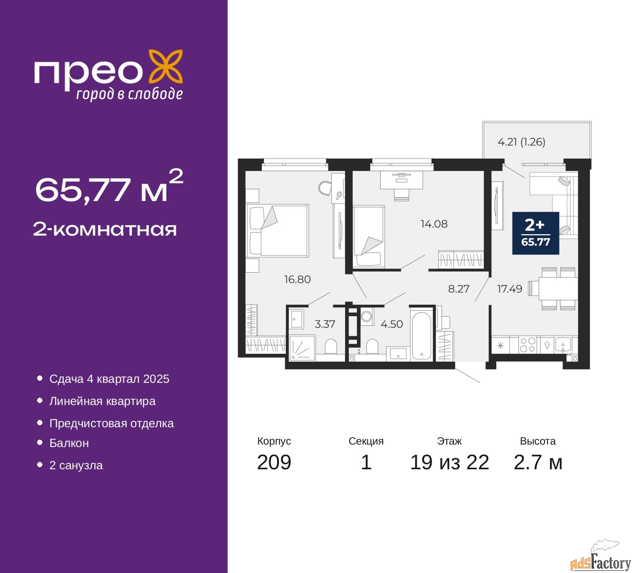 Квартира находится в корпусе 209. Дом монолитный, одноподъездный, высотой 22 этажа. На этаже 8 квартир. В подъезде 1 пассажирский и 1 грузовой лифт. Окончание строительства - 4 квартал 2025 года. Оформление сделки по договору долевого участия.