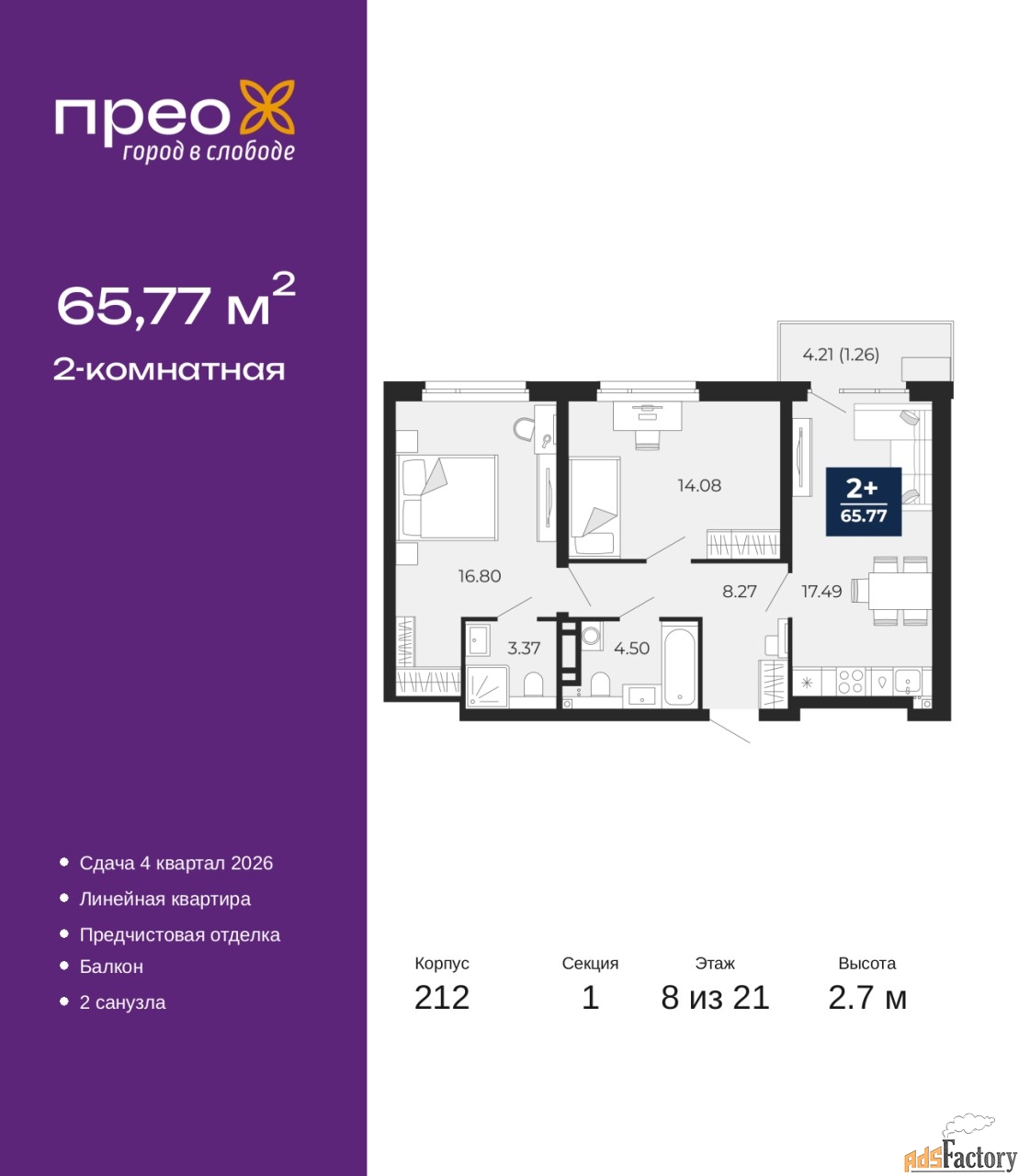 Квартира находится в корпусе 212. Дом монолитный, одноподъездный, высотой 21 этаж. На этаже 8 квартир. В подъезде 2 пассажирских и 1 грузовой лифт. Окончание строительства - 4 квартал 2026 года. Оформление сделки по договору долевого участия.