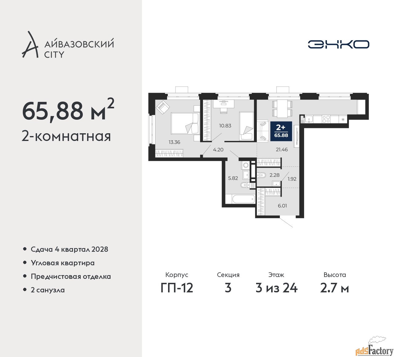 Дом монолитный, многоподъездный, высотой 24 этажа. Квартира находится в 3-й секции в корпусе ГП-12. На этаже 6 квартир. В подъезде 1 пассажирский и 1 грузовой лифт. Окончание строительства - 4 квартал 2028 года. Оформление сделки по договору долевого участия.