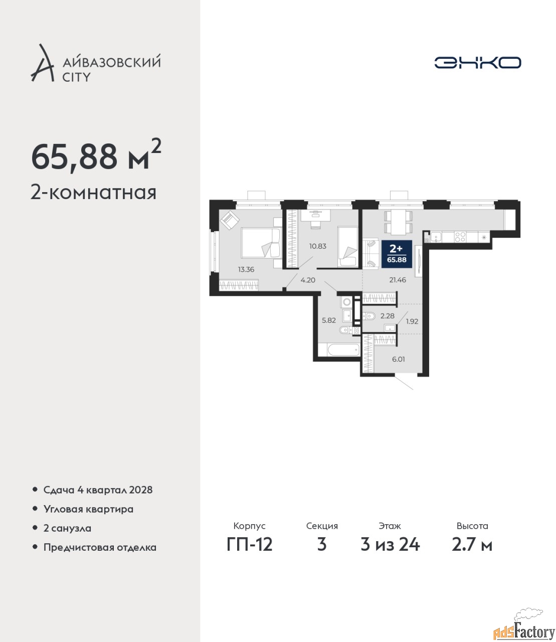 Дом монолитный, многоподъездный, высотой 24 этажа. Квартира находится в 3-й секции в корпусе ГП-12. На этаже 6 квартир. В подъезде 1 пассажирский и 1 грузовой лифт. Окончание строительства - 4 квартал 2028 года. Оформление сделки по договору долевого участия.