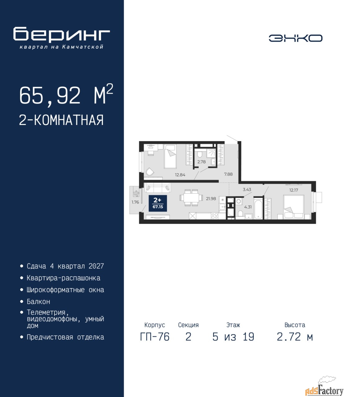Дом монолитный, черырехподъездный, переменной этажности, от 19 до 24 этажей. Квартира находится во 2-й секции высотой 19 этажей в корпусе ГП-76. На этаже 8 квартир. В подъезде 1 пассажирский и 1 грузовой лифт. Окончание строительства - 4 квартал 2027 года. Оформление сделки по договору долевого участия.