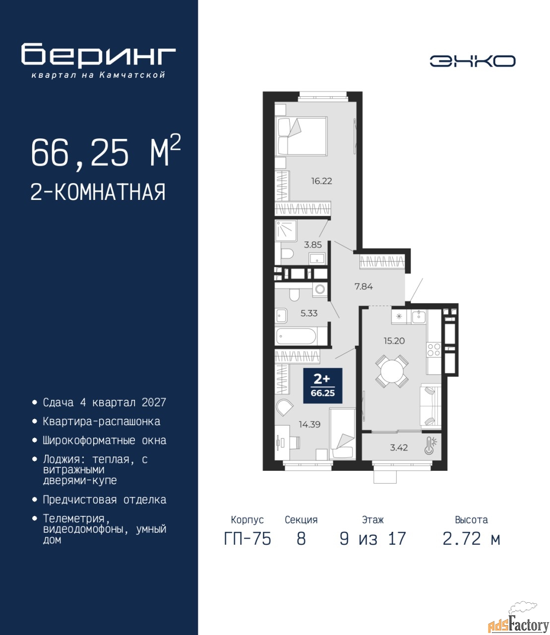 Дом монолитный, многоподъездный, переменной этажности, от 17 до 24 этажей. Квартира находится в 8-й секции высотой 17 этажей в корпусе ГП-75. На этаже 8 квартир. В подъезде 2 пассажирских и 1 грузовой лифт. Окончание строительства - 4 квартал 2027 года. Оформление сделки по договору долевого участия.