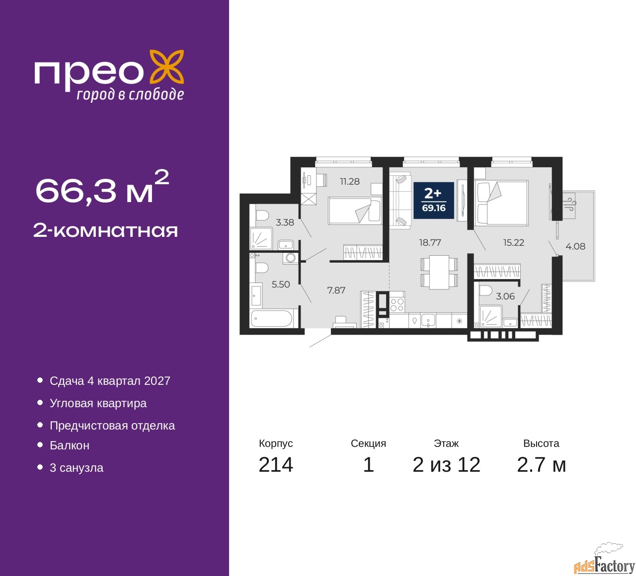 Дом монолитный, двухподъездный, переменной этажности, от 12 до 20 этажей. Квартира находится в 1-й секции высотой 12 этажей в корпусе 214. На этаже 8 квартир. В подъезде 1 пассажирский и 1 грузовой лифт. Окончание строительства - 4 квартал 2027 года. Оформление сделки по договору долевого участия.