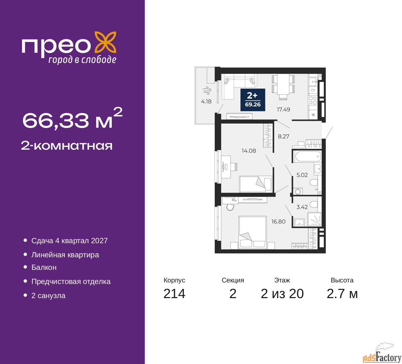 Дом монолитный, двухподъездный, переменной этажности, от 12 до 20 этажей. Квартира находится во 2-й секции высотой 20 этажей в корпусе 214. На этаже 8 квартир. В подъезде 1 пассажирский и 1 грузовой лифт. Окончание строительства - 4 квартал 2027 года. Оформление сделки по договору долевого участия.