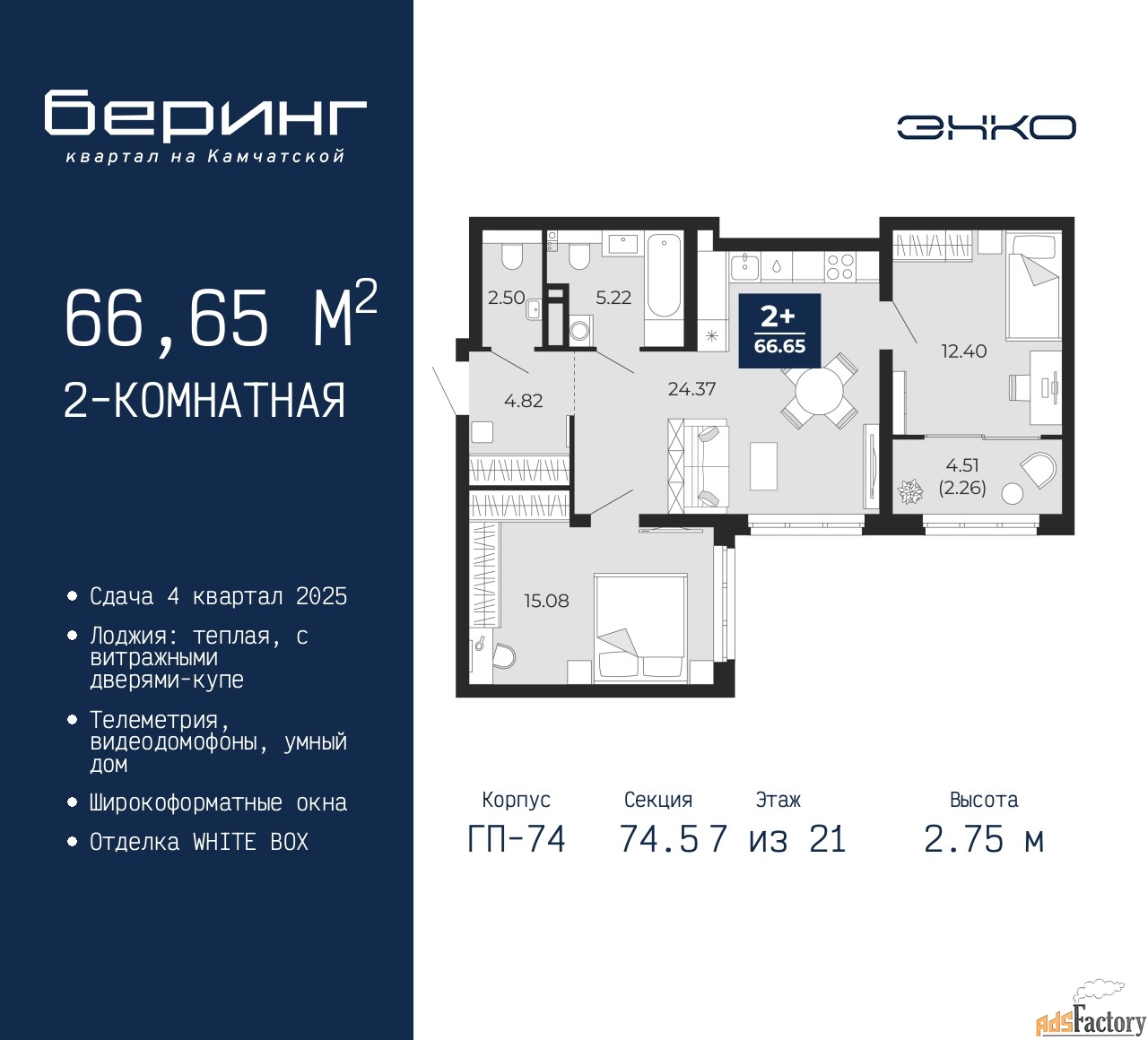Дом монолитный, многоподъездный, переменной этажности, от 9 до 21 этажей. Квартира находится в 74.5-й секции высотой 21 этаж в корпусе ГП-74. На этаже 7 квартир. В подъезде 1 пассажирский и 1 грузовой лифт. Окончание строительства - 4 квартал 2025 года. Оформление сделки по договору долевого участия.