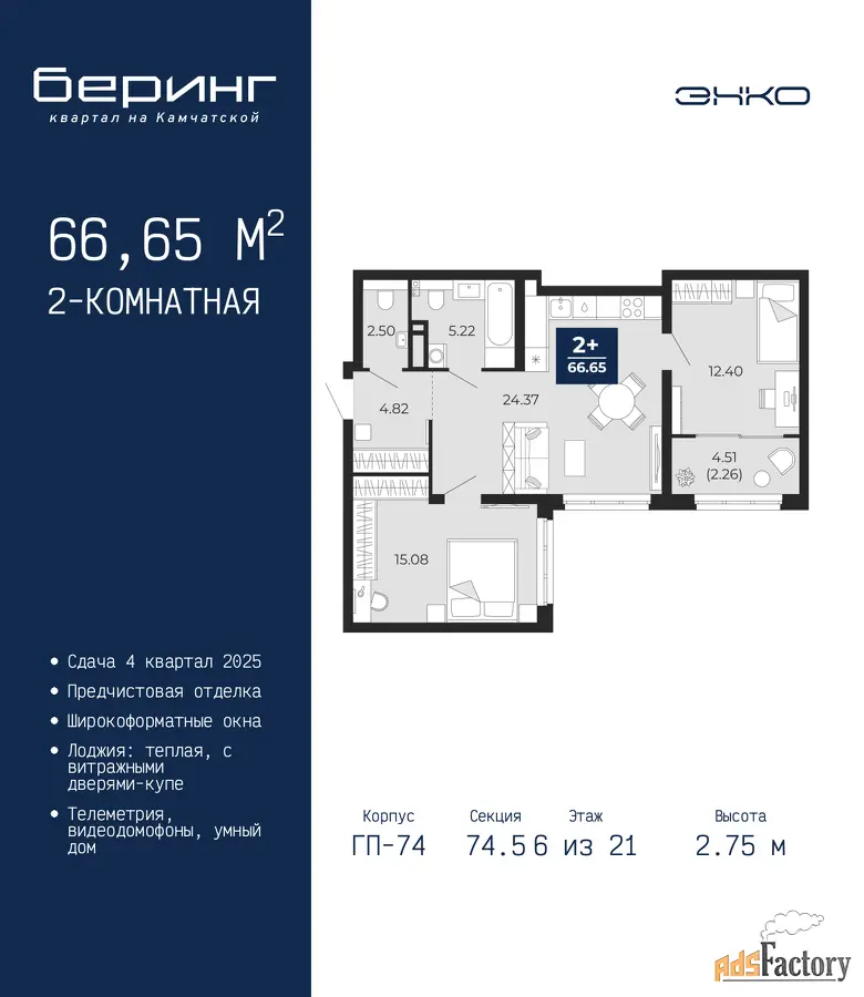 Дом монолитный, многоподъездный, переменной этажности, от 9 до 21 этажей. Квартира находится в 74.5-й секции высотой 21 этаж в корпусе ГП-74. На этаже 7 квартир. В подъезде 1 пассажирский и 1 грузовой лифт. Окончание строительства - 1 квартал 2026 года. Оформление сделки по договору долевого участия.