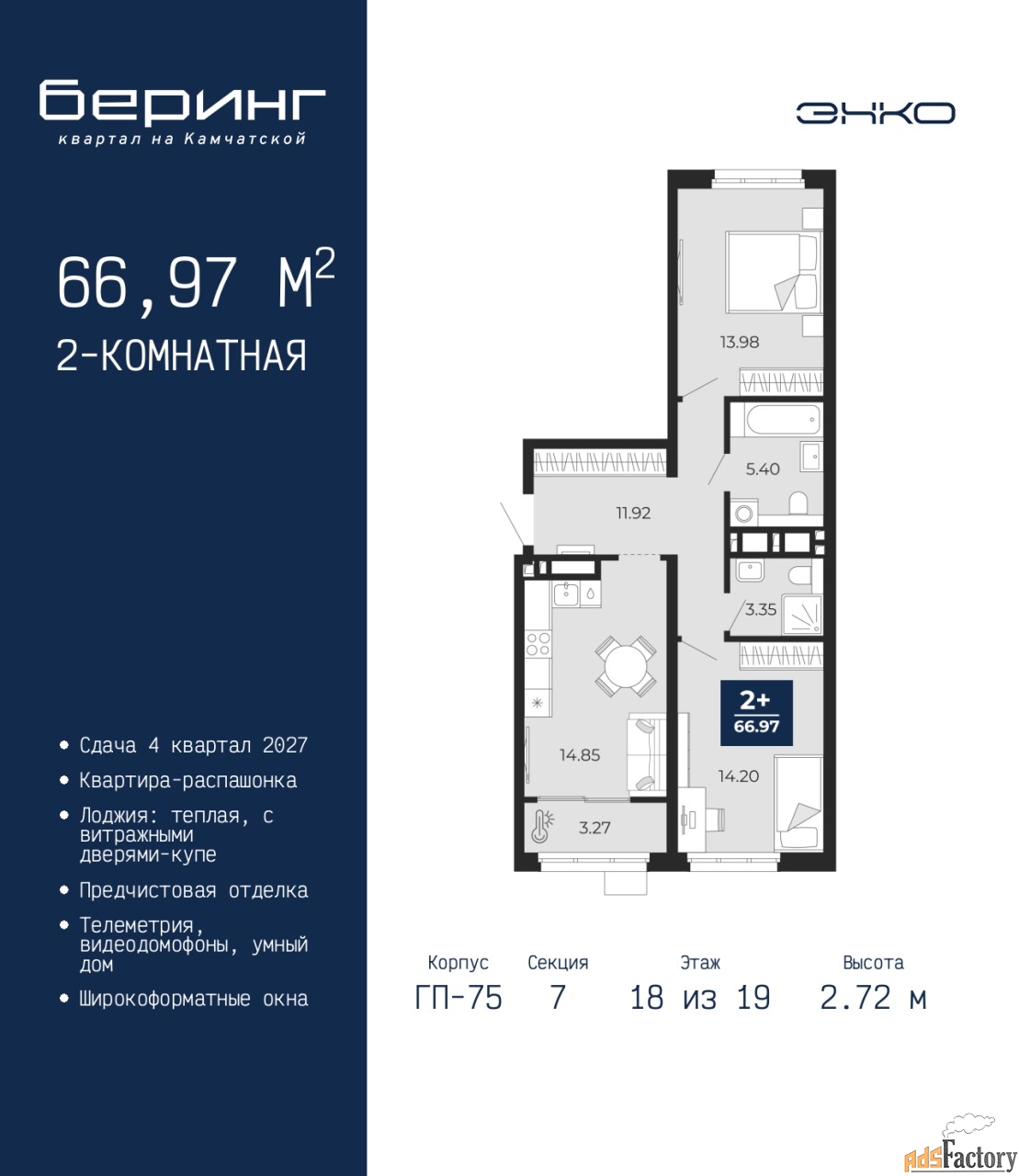 Дом монолитный, многоподъездный, переменной этажности, от 17 до 24 этажей. Квартира находится в 7-й секции высотой 19 этажей в корпусе ГП-75. На этаже 7 квартир. В подъезде 2 пассажирских и 1 грузовой лифт. Окончание строительства - 4 квартал 2027 года. Оформление сделки по договору долевого участия.