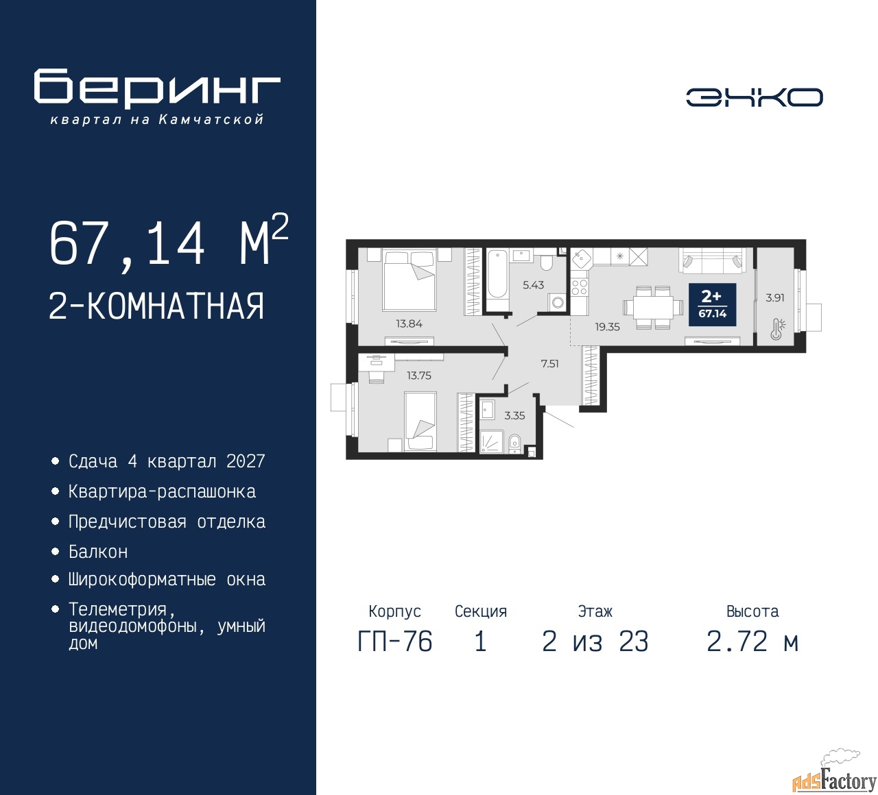 Дом монолитный, черырехподъездный, переменной этажности, от 19 до 24 этажей. Квартира находится в 1-й секции высотой 23 этажа в корпусе ГП-76. На этаже 7 квартир. В подъезде 2 пассажирских и 1 грузовой лифт. Окончание строительства - 4 квартал 2027 года. Оформление сделки по договору долевого участия.