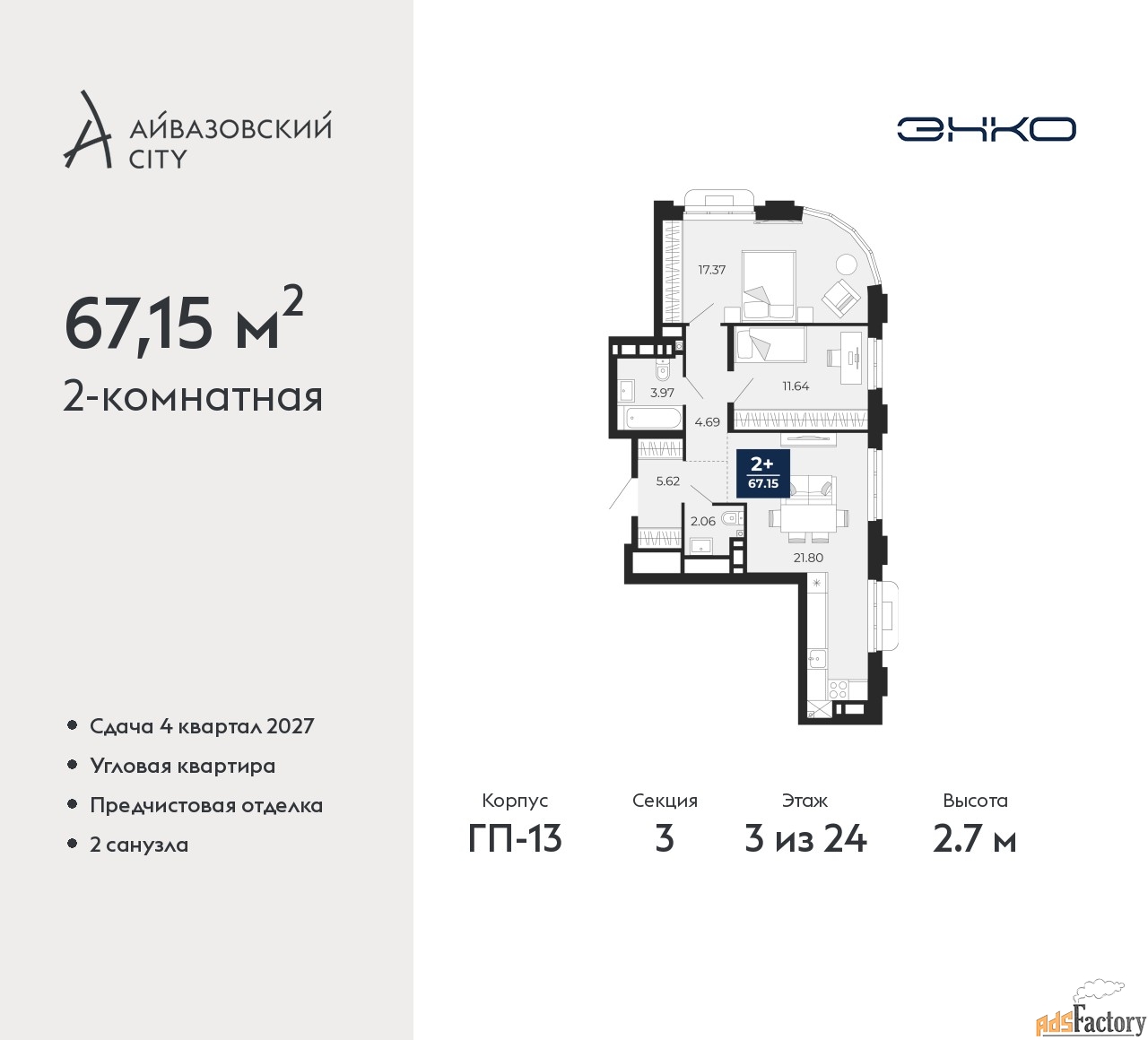 | Высота потолков (м.) | 2.7 |