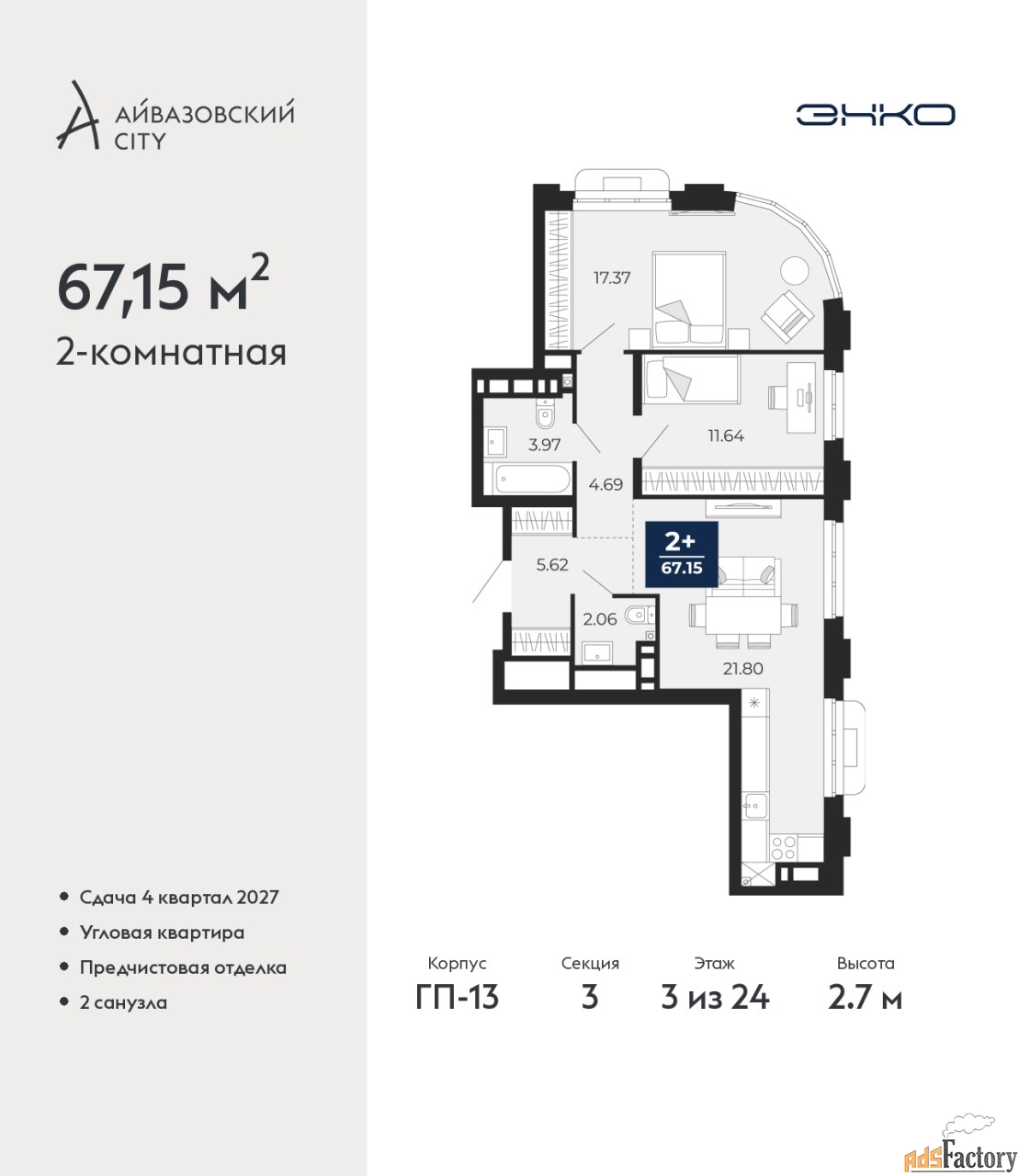 Дом монолитный, многоподъездный, высотой 24 этажа. Квартира находится в 3-й секции в корпусе ГП-13. На этаже 9 квартир. В подъезде 1 пассажирский и 1 грузовой лифт. Окончание строительства - 4 квартал 2027 года. Оформление сделки по договору долевого участия.
