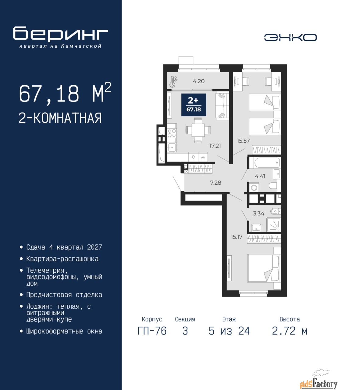 Дом монолитный, черырехподъездный, переменной этажности, от 19 до 24 этажей. Квартира находится в 3-й секции высотой 24 этажа в корпусе ГП-76. На этаже 6 квартир. В подъезде 1 пассажирский и 1 грузовой лифт. Окончание строительства - 4 квартал 2027 года. Оформление сделки по договору долевого участия.
