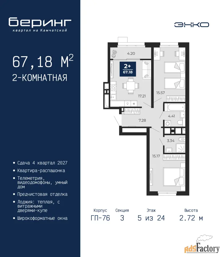 Дом монолитный, черырехподъездный, переменной этажности, от 19 до 24 этажей. Квартира находится в 3-й секции высотой 24 этажа в корпусе ГП-76. На этаже 6 квартир. В подъезде 1 пассажирский и 1 грузовой лифт. Окончание строительства - 4 квартал 2027 года. Оформление сделки по договору долевого участия.