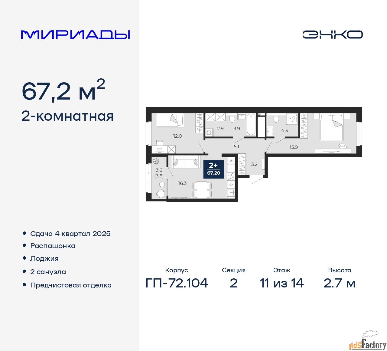 Дом монолитный, двухподъездный, переменной этажности, от 14 до 18 этажей. Квартира находится во 2-й секции высотой 14 этажей в корпусе ГП-72.104. На этаже 8 квартир. В подъезде 1 пассажирский и 1 грузовой лифт. Окончание строительства - 4 квартал 2025 года. Оформление сделки по договору долевого участия.