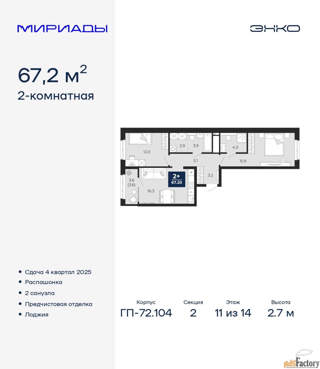 Дом монолитный, двухподъездный, переменной этажности, от 14 до 18 этажей. Квартира находится во 2-й секции высотой 14 этажей в корпусе ГП-72.104. На этаже 8 квартир. В подъезде 1 пассажирский и 1 грузовой лифт. Окончание строительства - 4 квартал 2025 года. Оформление сделки по договору долевого участия.