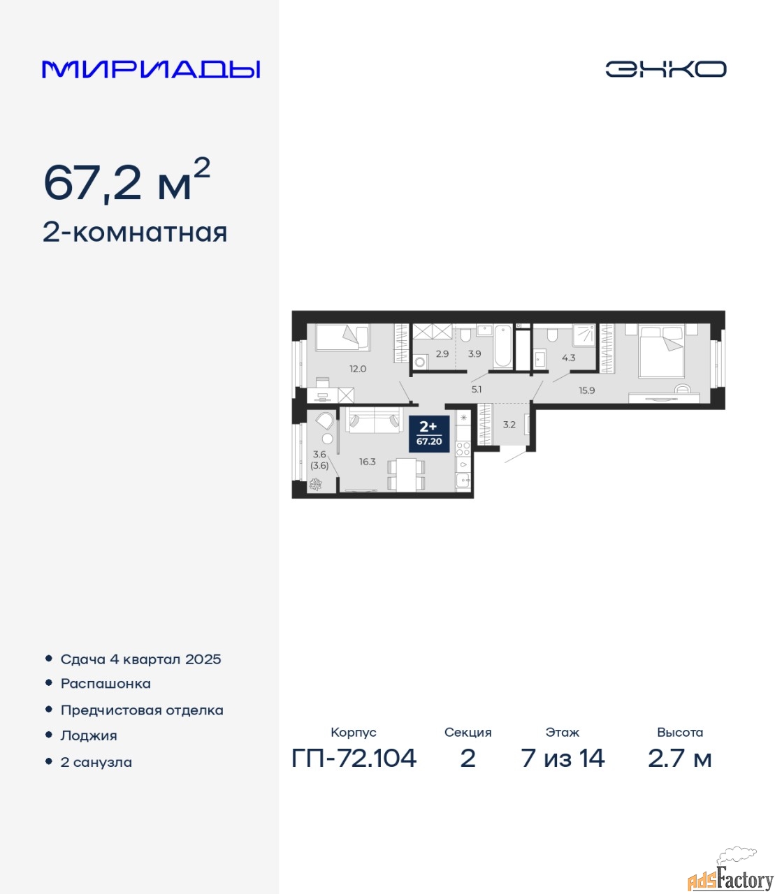 Дом монолитный, двухподъездный, переменной этажности, от 14 до 18 этажей. Квартира находится во 2-й секции высотой 14 этажей в корпусе ГП-72.104. На этаже 8 квартир. В подъезде 1 пассажирский и 1 грузовой лифт. Окончание строительства - 4 квартал 2025 года. Оформление сделки по договору долевого участия.