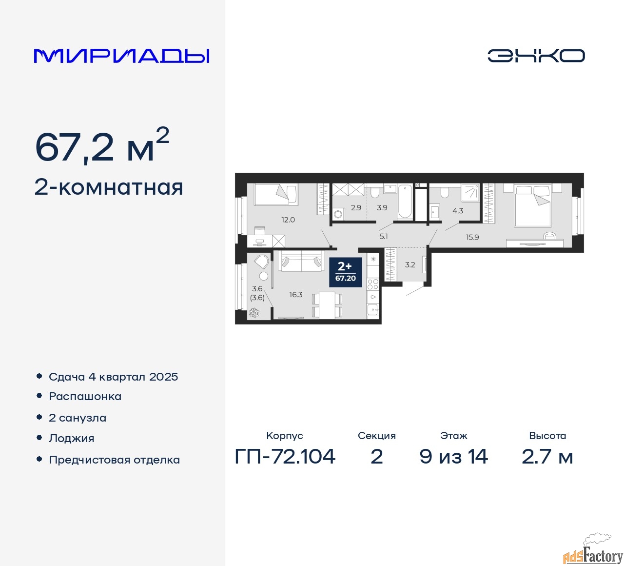 Дом монолитный, двухподъездный, переменной этажности, от 14 до 18 этажей. Квартира находится во 2-й секции высотой 14 этажей в корпусе ГП-72.104. На этаже 8 квартир. В подъезде 1 пассажирский и 1 грузовой лифт. Окончание строительства - 4 квартал 2025 года. Оформление сделки по договору долевого участия.