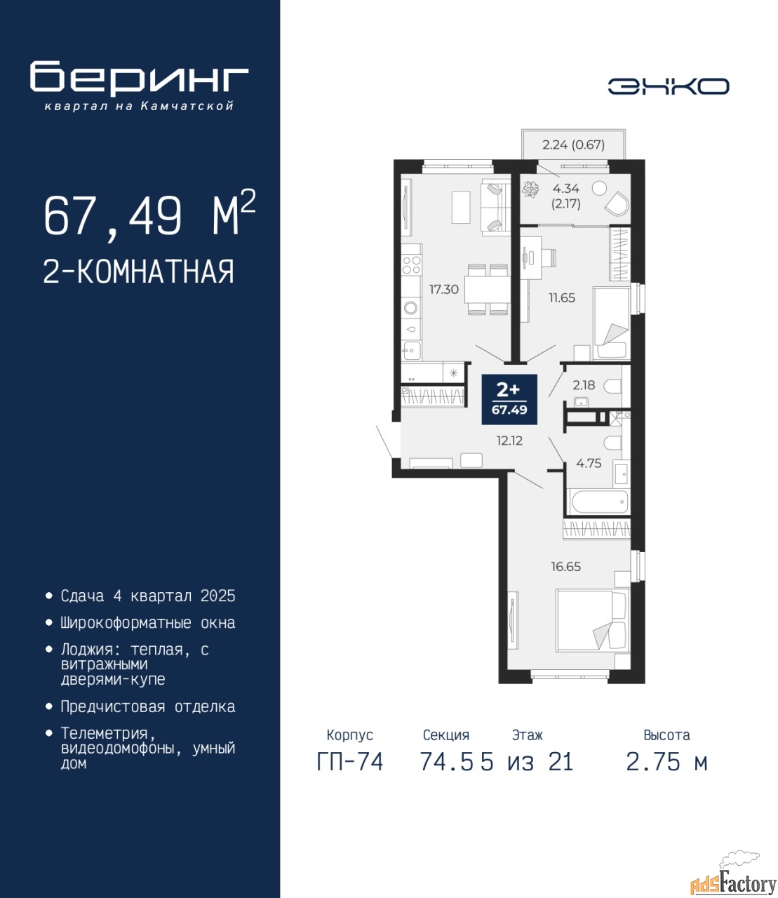 Дом монолитный, многоподъездный, переменной этажности, от 9 до 21 этажей. Квартира находится в 74.5-й секции высотой 21 этаж в корпусе ГП-74. На этаже 7 квартир. В подъезде 1 пассажирский и 1 грузовой лифт. Окончание строительства - 1 квартал 2026 года. Оформление сделки по договору долевого участия.