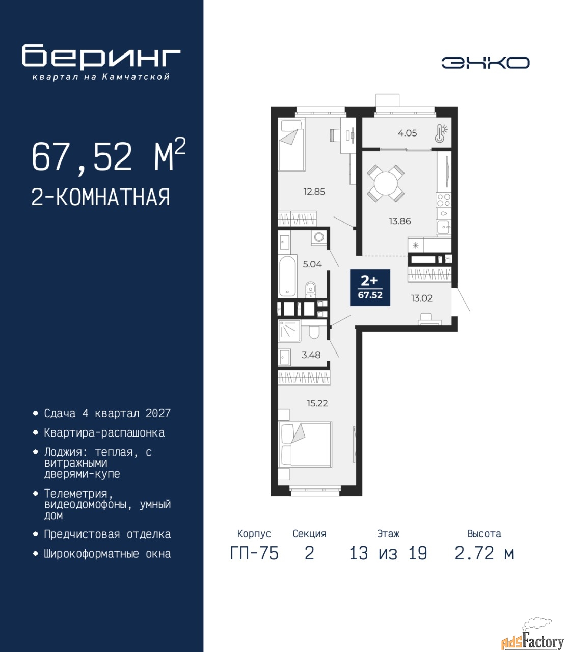 Дом монолитный, многоподъездный, переменной этажности, от 17 до 24 этажей. Квартира находится во 2-й секции высотой 19 этажей в корпусе ГП-75. На этаже 7 квартир. В подъезде 2 пассажирских и 1 грузовой лифт. Окончание строительства - 4 квартал 2027 года. Оформление сделки по договору долевого участия.