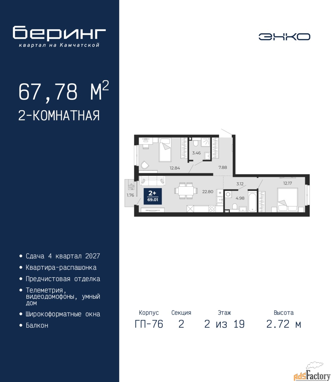 Дом монолитный, черырехподъездный, переменной этажности, от 19 до 24 этажей. Квартира находится во 2-й секции высотой 19 этажей в корпусе ГП-76. На этаже 8 квартир. В подъезде 1 пассажирский и 1 грузовой лифт. Окончание строительства - 4 квартал 2027 года. Оформление сделки по договору долевого участия.