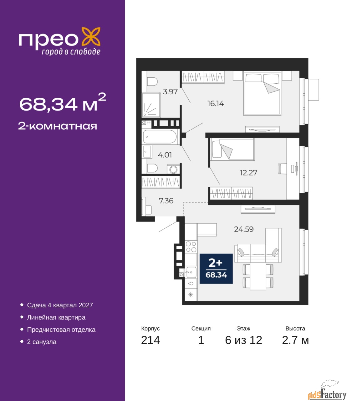 Дом монолитный, двухподъездный, переменной этажности, от 12 до 20 этажей. Квартира находится в 1-й секции высотой 12 этажей в корпусе 214. На этаже 8 квартир. В подъезде 1 пассажирский и 1 грузовой лифт. Окончание строительства - 4 квартал 2027 года. Оформление сделки по договору долевого участия.