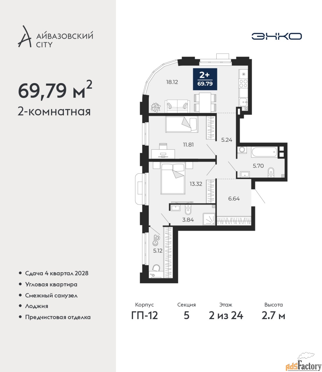 Дом монолитный, многоподъездный, высотой 24 этажа. Квартира находится в 5-й секции в корпусе ГП-12. На этаже 5 квартир. В подъезде 1 пассажирский и 1 грузовой лифт. Окончание строительства - 4 квартал 2028 года. Оформление сделки по договору долевого участия.