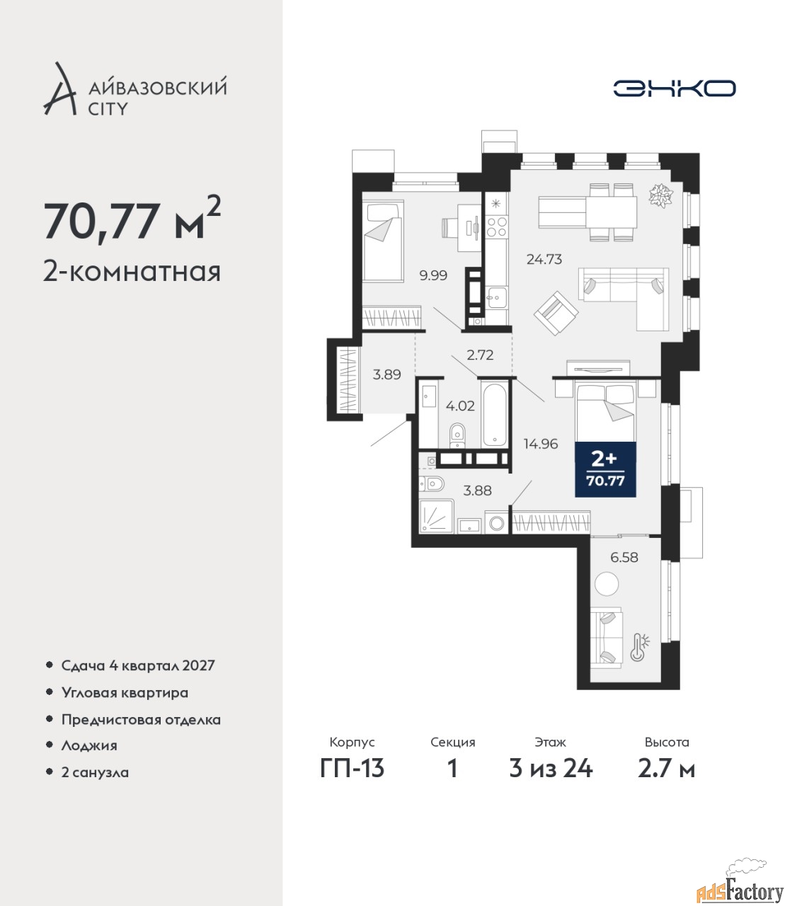 Дом монолитный, многоподъездный, высотой 24 этажа. Квартира находится в 1-й секции в корпусе ГП-13. На этаже 2 квартиры. Окончание строительства - 4 квартал 2027 года. Оформление сделки по договору долевого участия.