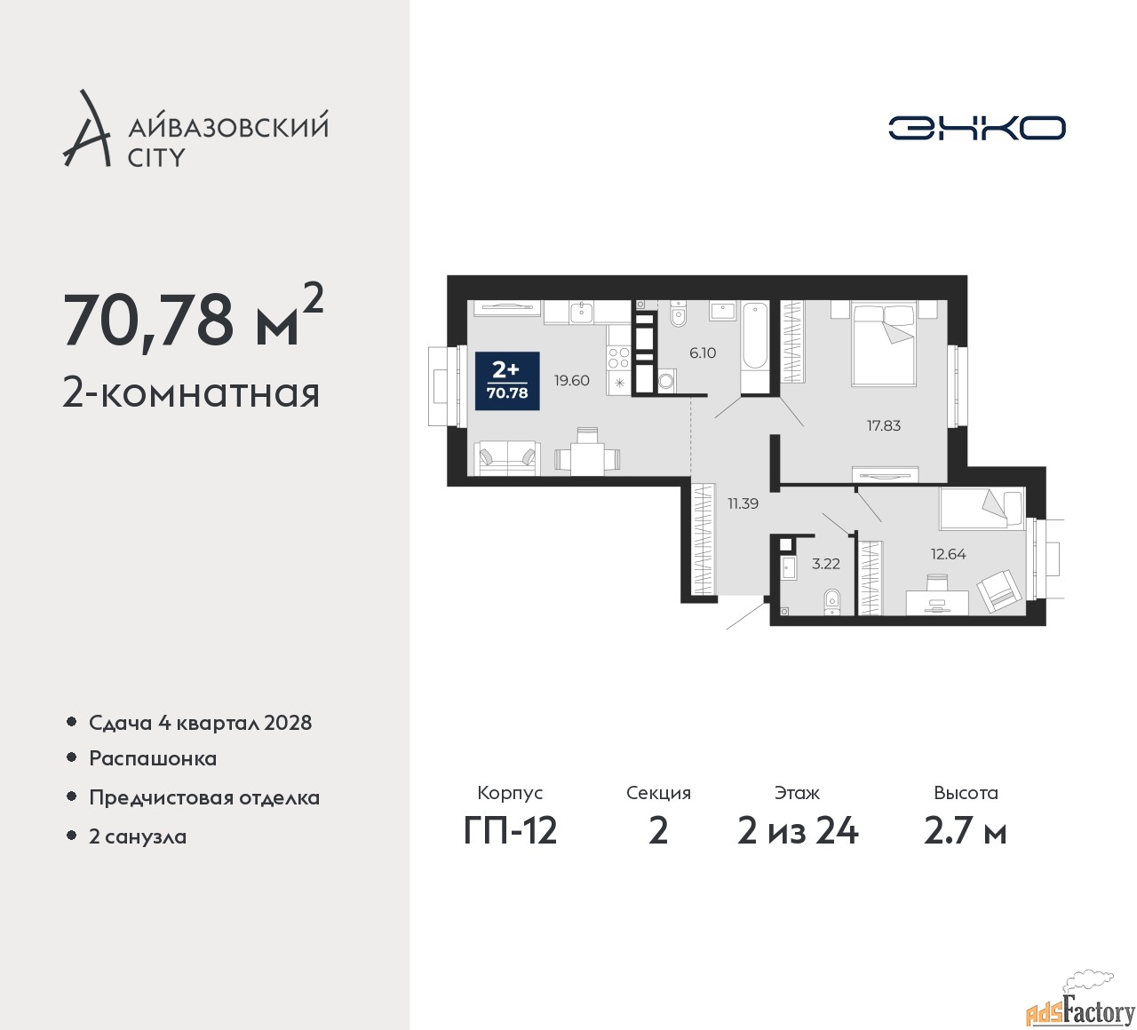 Дом монолитный, многоподъездный, высотой 24 этажа. Квартира находится во 2-й секции в корпусе ГП-12. На этаже 6 квартир. В подъезде 1 пассажирский и 1 грузовой лифт. Окончание строительства - 4 квартал 2028 года. Оформление сделки по договору долевого участия.